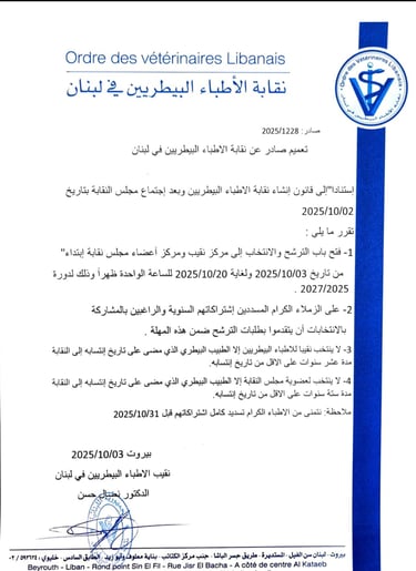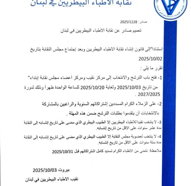 The Lebanese Veterinary Syndicate is the official representative body for veterinary professionals in Lebanon. Our mission is to promote and protect the veterinary profession in Lebanon by supporting veterinarians, ensuring the highest standards of practice, advocating for animal welfare, and contributing to public health. We aim to provide continuous professional development, legal and ethical guidance, and a unified voice for all veterinarians across the country.